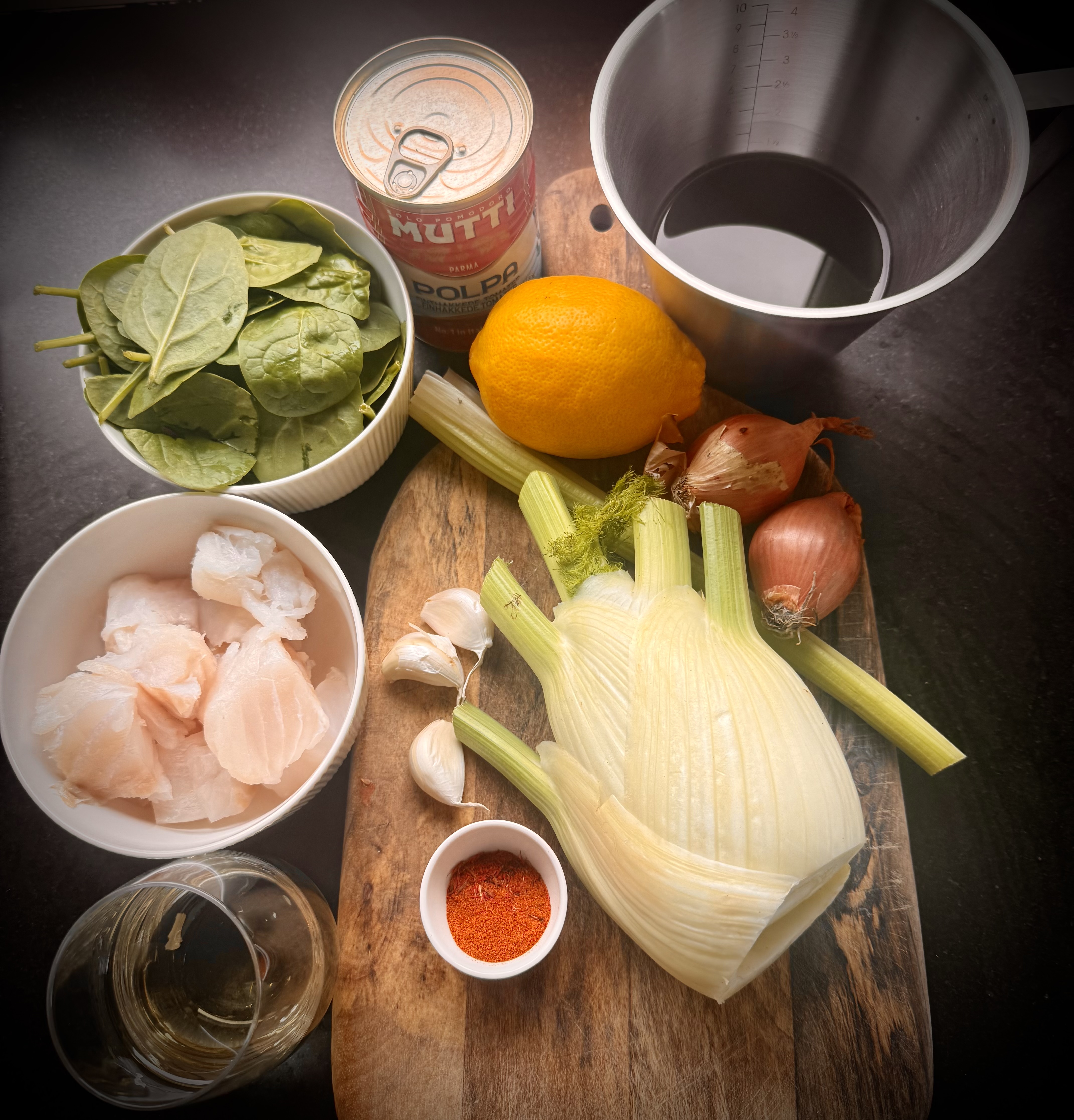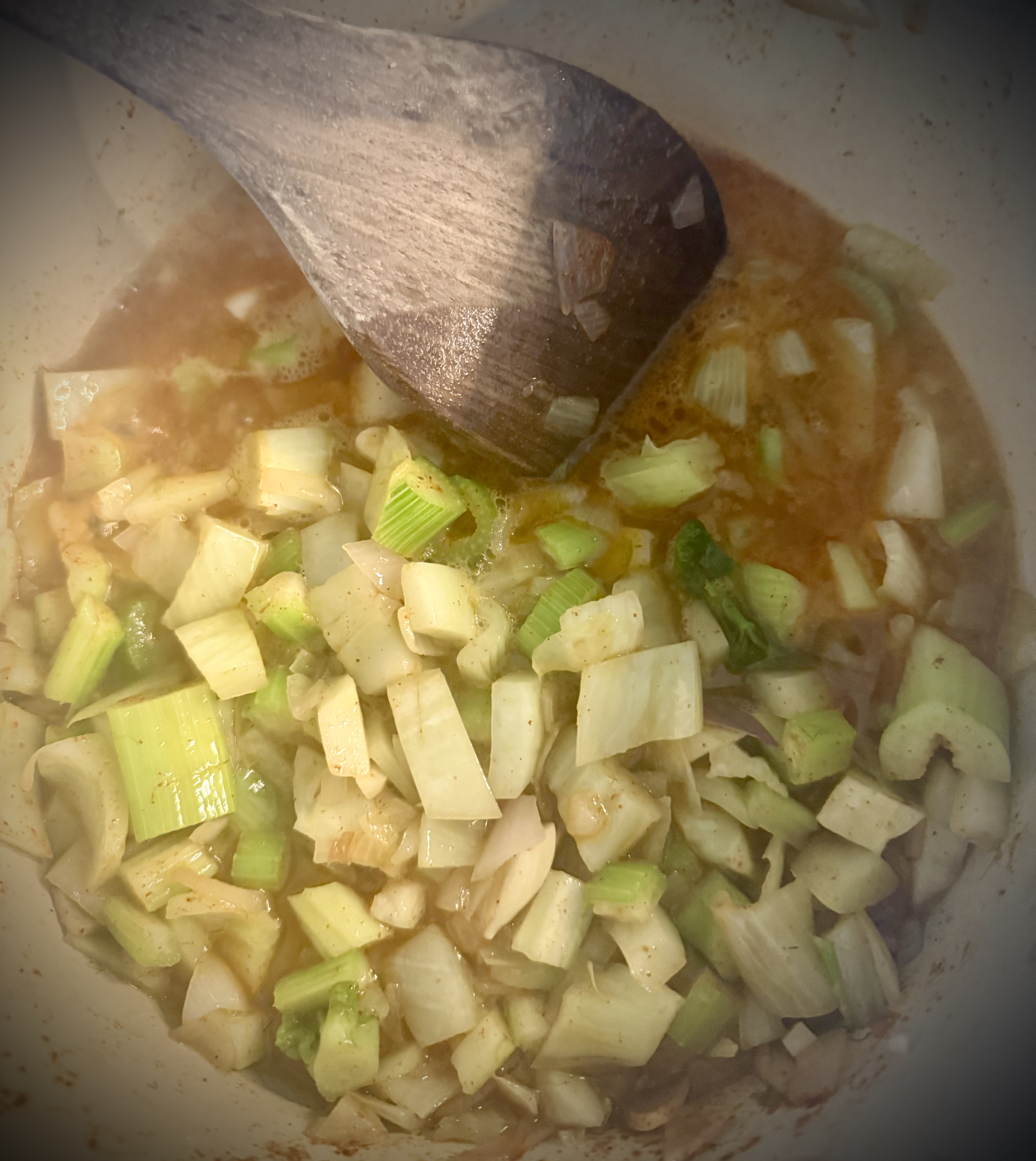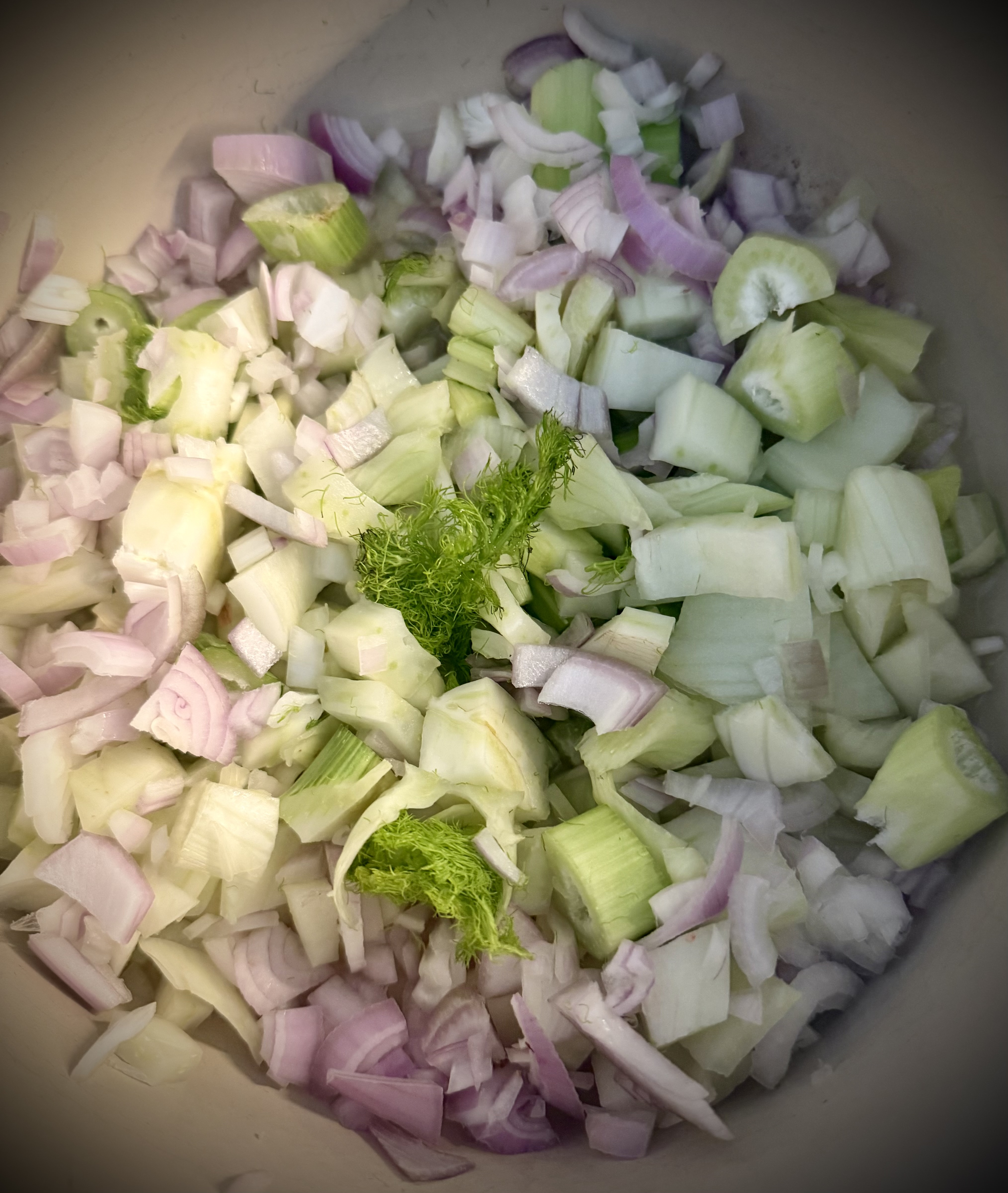 Varm olivenolje i en stor jerngryte med lokk. Finhakk sjalottløk, stangselleri og halvparten av fennikelen. Surr i olje til det er mykt og blankt.