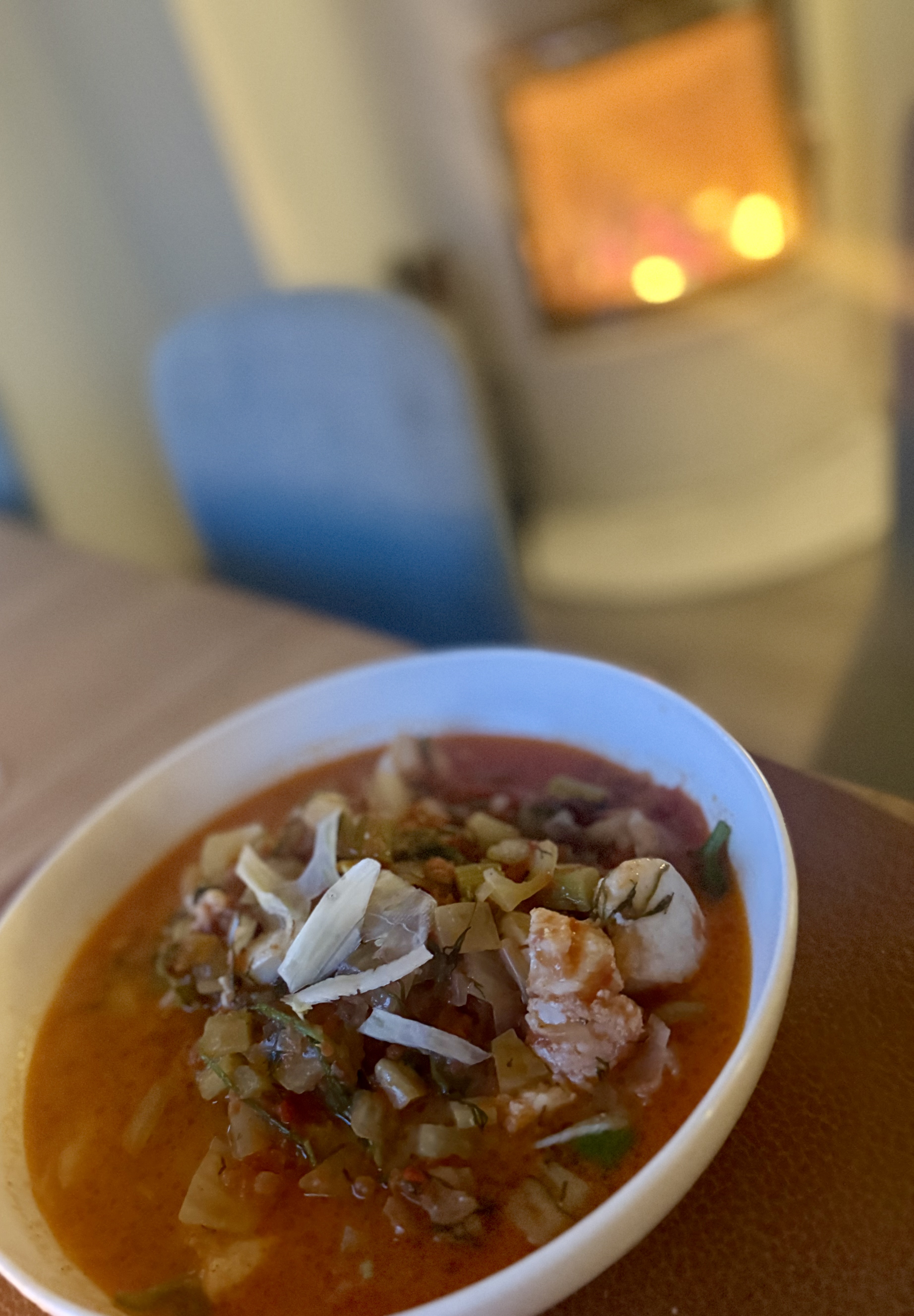 Torskegryte med peis i bakgrunnen.