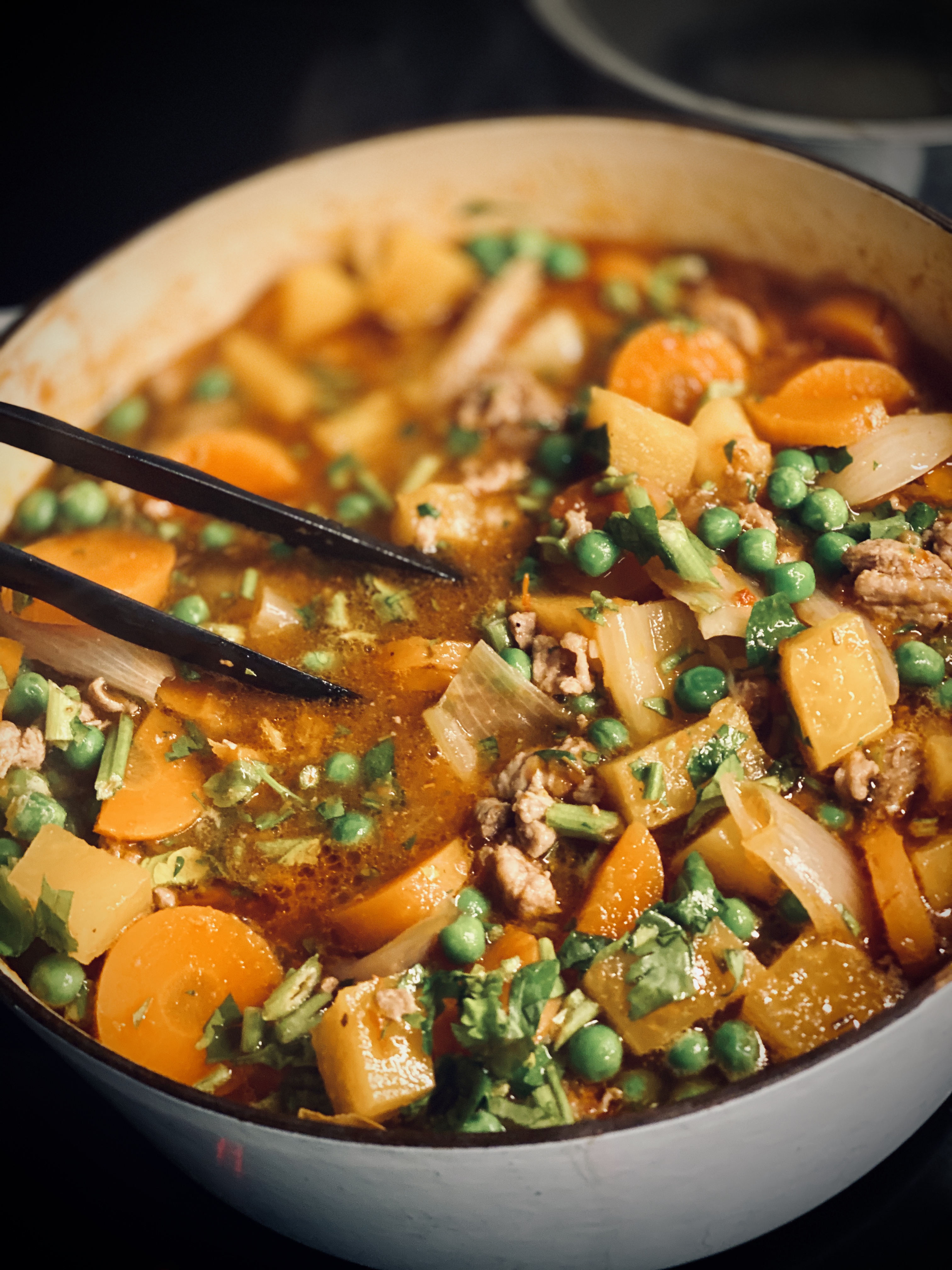 Å skjære kjøtt kan være en utfordring. Jeg kjøpte ferdig oppskåret lammebog uten ben. Hvis du ikke finner tak i dette, men ender opp med lammekjøtt med ben, anbefales det å steke lammet litt før du tar det opp, fjerner bena og skjærer det i biter.
